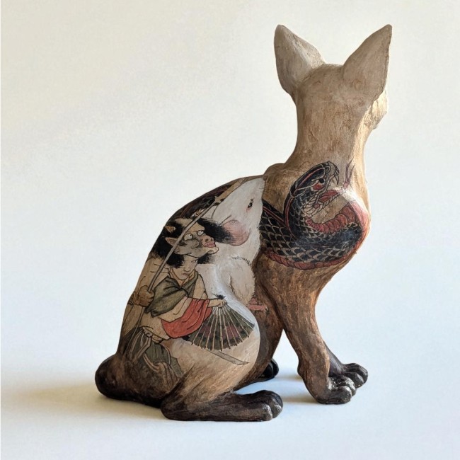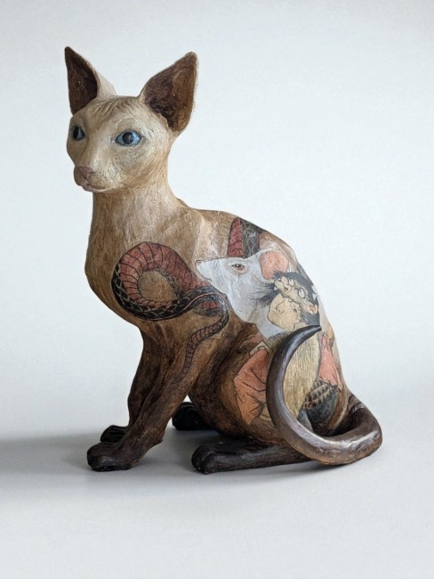 Chat nu tatoué, céramique en collaboration avec Syl20cbien, pièce unique.